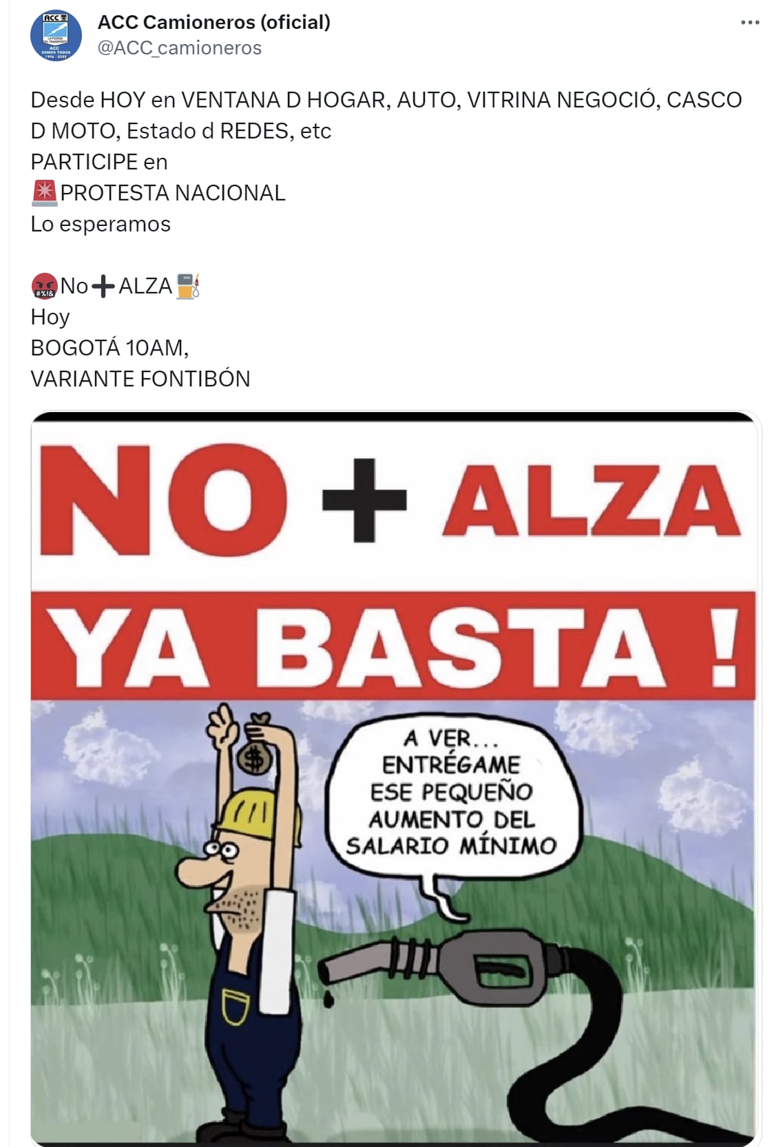 Según su presidente Alfonso Medrano la manifestación se presenta como protesta por los incrementos del precio de la gasolina, que según dice el gremio “ya se encuentra equilibrado al precio internacional”, como era el propósito del Gobierno nacional.